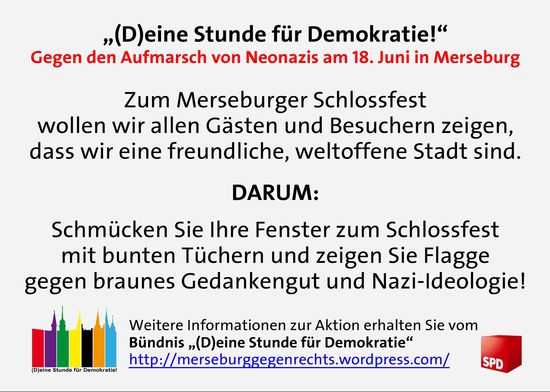 Wir möchten Sie bitten, sich an den Aktionen des Bündnisses gegen den Naziaufmarsch in Merseburg zu beteiligen! Helfen Sie uns bei der Besetzung des Infostands – je mehr Personen am Infostand beteiligt sind, umso stärker ist die SPD.