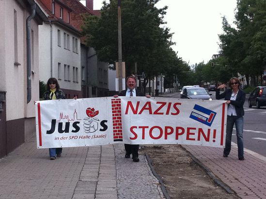 Wie 250 Bürger Merseburgs beteiligten sich auch Mitglieder des SPD-Ortsvereins an den Aktionen unter dem Motto "(D)eine Stunde für Demokratie" gegen den Nazi-Aufmarsch am 18.6.2011.